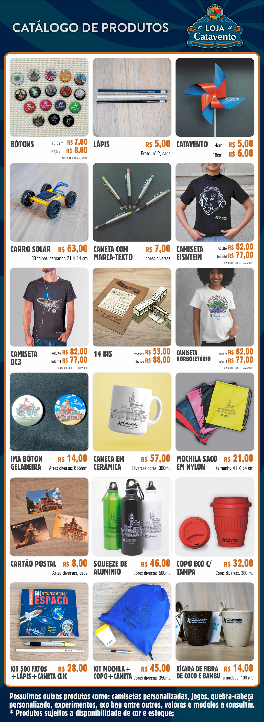 A loja do Museu Catavento funciona de terça a domingo das 09h às 18h e traz, além dos suvenires clássicos como lápis, bottons, chaveiros, camisetas, canecas, entre outros, itens super originais, desde os mais simples aos mais elaborados.